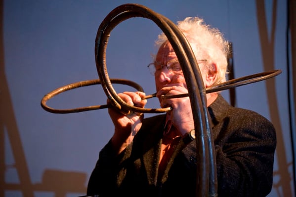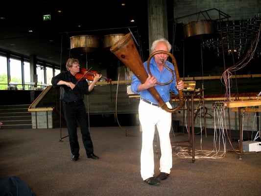 Fuchs played his horn (or whatever one wants to call his homemade tuba imitation) with powerful breath, accompanied by and rhythmically tuned to the crescendo and decrescendo of the Autobahn traffic coming from the bridge going right over the garden-show park. And for the finale, Fuchs went down on his knees and dropped two heavy steel balls, more likely to be found at the shot-put contest at the Olympics, with a powerful bang onto a steel plate. Kloing!!! The Audience loved it...