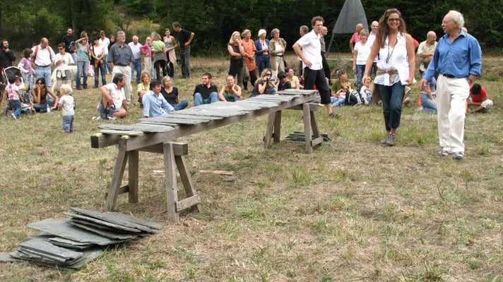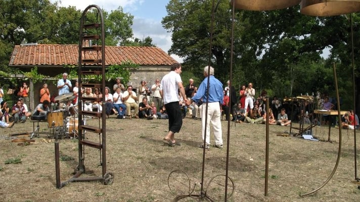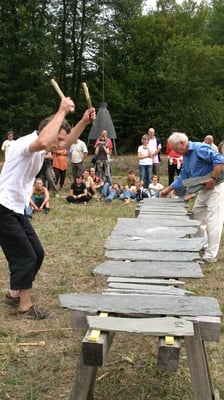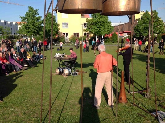 Begleitet vom und rhythmisch abgestimmt auf an-und abschwellendes Rauschen des Verkehrs auf der Autobahnbrücke, die über den Gartenschaupark führt, stiess Fuchs kräftig ins Horn - oder wie auch immer seine handgefertigte Tuba-Imitation zu betiteln ist. Und gewaltig metallisch knallte es, als Fuchs zum Finale nieder kniete und zwei Eisenkugeln, die man eher bei den Olympischen Spielen im Kugelstossring findet, auf eine Stahlplatte niedersausen liess. <Kloing!>. Das Publikum hatte seine Freude...