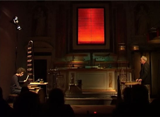 ...Gelohnt hatte sich der dreimonatige Eifer nicht zuletzt deshalb, weil Paul Fuchs bei der Vernissage zusätzlich eine Klanginstallation aufgebaut hatte und den erstaunlich zahlreichen erstaunten Zaungästen eine launige Performance bot. Zum Klingen brachte er seine hinlänglich bekannten Ballastsaiten-Instrumente. Kenner seines Oeuvres überraschte er aber auch mit elektromechanischen Spielereien. An aufgehängten Stahl-und Bronzeblechen hatte er Elektromotoren befestigt - zu starten und zu stoppen von einem rührend verkabelten Schalttisch -, die drehende Unwuchten beschleunigen, wodurch die Bleche lautstark ins Vibrieren versetzt werden.