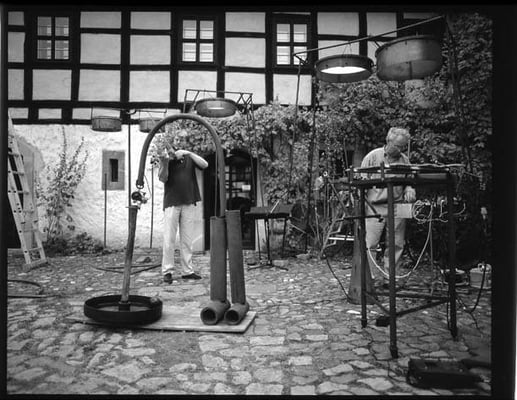 ...It was worth the three month's effort after all, especially since Paul Fuchs constructed a sound installation for the Grand Opening, and offered to the unexpectedly large crowd of surprised onlookers/listeners an amusing and temperamental performance. He extracted great sounds from his by now reasonably well known Ballastsaiten instruments. But he even surprised those familiar with his oeuvres by toying with electro-mechanical gadgets. To suspended metal sheets of steel and bronze he attached electric motors, which, being turned on and off from a lovingly wired control console, put the sheets into noisy vibrations by means of eccentric flywheels.